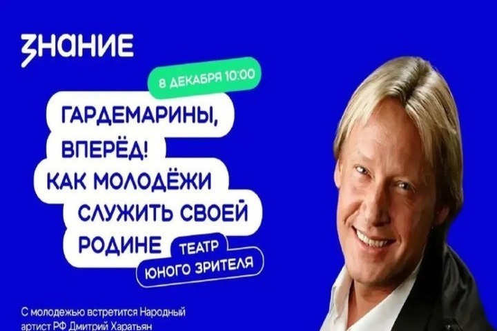 В Астрахани 8 декабря в 10:00 в Театре юного зрителя состоится встреча с народным артистом России Дмитрием Харатьяном. Лекция проводится обществом «Знание» в рамках региональных мероприятий, приуроченных ко Дню Героя России, и посвящена теме «Гардемарины, вперёд! Как молодежи служить своей Родине».