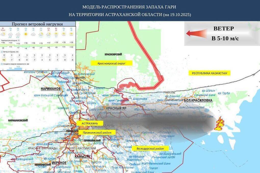 Источником запаха стали ландшафтные пожары, бушующие на сопредельной территории Республики Казахстан. С учётом восточного направления ветра, скорость которого составляет 5-10 метров в секунду, дым и продукты горения переносятся на территорию Астраханской области, вызывая характерный запах в воздухе.