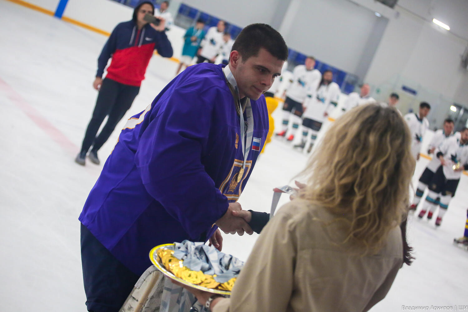 В Астрахани восемь хоккейных команд решили необычно отпраздновать День России. Более ста мужчин и одна женщина вышли на лед в центре зимних видов спорта, чтобы узнать кто из них лучше играет в хоккей. Матч проходил по правилам ночной хоккейной лиги.