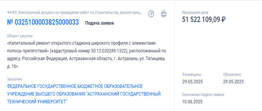 На платформе государственных закупок опубликован любопытный тендер, предусматривающий крупный госконтракт на реконструкцию открытого спортивного комплекса. Объектом ремонтных работ станет стадион Астраханского Государственного Технического университета, располагающийся по адресу улица Татищева, дом 16. Стоимость заказа составляет внушительную сумму — 51,5 миллиона рублей.