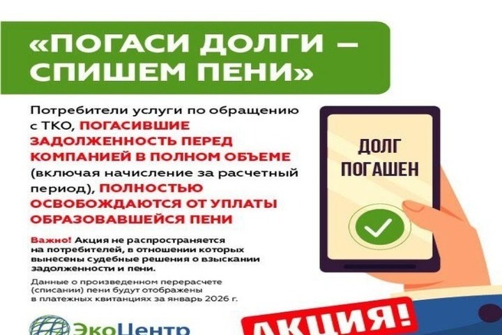 После того как задолженность будет закрыта в полном объёме, специалисты «ЭкоЦентра» проведут перерасчёт, полностью освободив добросовестных плательщиков от уплаты образовавшейся пени. Результаты перерасчёта и списания пени будут видны в платёжных квитанциях, которые потребители получат за январь 2026 года.