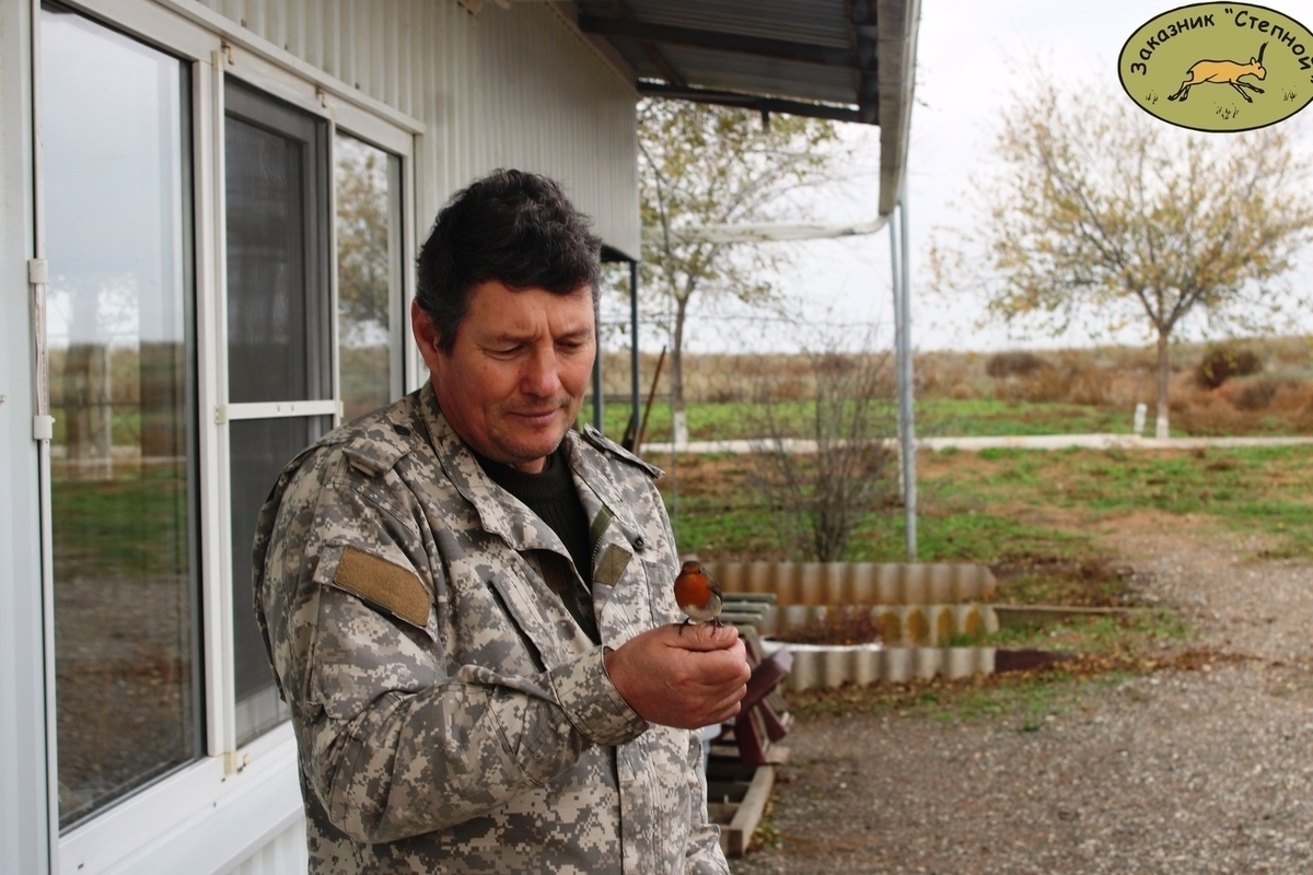 Раннее утро в заказнике «Степной» превратилось в нежный эпизод из мультфильма: готовя служебный автомобиль перед утренним обходом, один из инспекторов вышел на улицу – и на его руку неожиданно опустилась зарянка.
