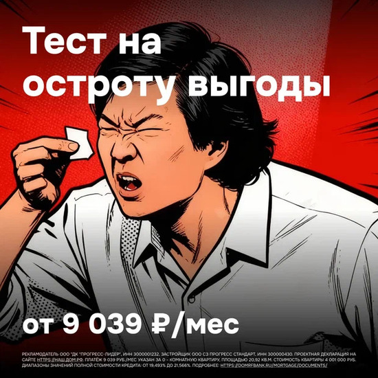 Реклама. Рекламодатель ООО "ДК "ПРОГРЕСС-ЛИДЕР", ИНН 3000001232, застройщик ООО СЗ ПРОГРЕСС СТАНДАРТ, ИНН 300000430. Проектная декларация на сайте https://наш.дом.рф. Платёж 9 039 руб./мес указан за 0 - комнатную квартиру, площадью 20,92 кв.м. Стоимость квартиры 4 001 000 руб. Диапазоны значений полной стоимости кредита: от 19,493% до 21,566%.